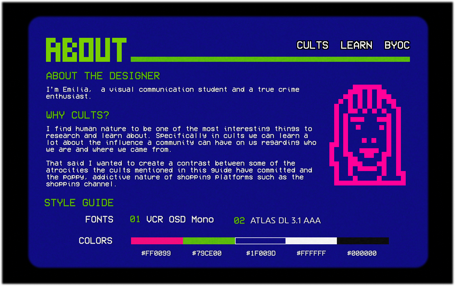 I chose to research, define and visualize a number of famous cults in history. This guide is meant to be more than a place to find information about these cults - it’s meant to give an idea of how deep human influence can get.
